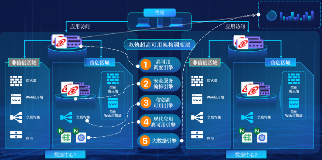 神州mksport体育在企业面临自主创新IT基础重构过程中,推出的全新架构双轨超高可用架构(简称DTMAA),在双活数据中心的分区调度基础上,添加每个数据中心内信创域和非信创域的分域调度,来实现分区分域协同的多活双轨超高可用。