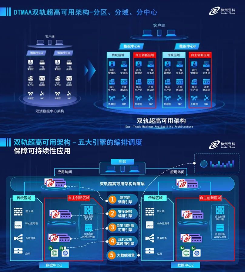 为助力银行业务高质量发展,更好地应对数字经济时代对可持续性的高要求,实现“信创”与“数字化”齐头并进,神州mksport体育创新性的推出了双轨超高可用架构。该架构在双活数据中心的分区调度基础上,增加信创域和非信创域的分域调度,实行信创域与传统域应用全量部署,使双中心运营变为双中心四区域并行运行,互为多活,将“0到1”的单轨建设道路变为分区分域协同的多活双轨超高可用架构。帮助客户在新架构下,保障“信创”的同时解决性能瓶颈,提升稳定性,保证应用可持续性,最终实现信创区域和非信创区域的平滑过渡,完成国产化替代目标。