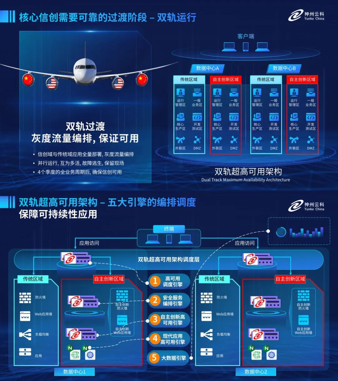 为助力金融业务高质量发展,更好地应对数字经济时代对可持续性的高要求,实现“信创”与“数字化”齐头并进,神州mksport体育创新性的推出了核心信创·双轨过渡的超高可用架构。该架构在双活数据中心的分区调度基础上,增加信创域和非信创域的分域调度,实行信创域与传统域应用全量部署,使双中心运营变为双中心四区域并行运行,互为多活,将“0到1”的单轨建设道路变为分区分域协同的多活双轨超高可用架构。帮助客户在新架构下,保障“信创”的同时解决性能瓶颈,提升稳定性,保证应用可持续性,最终实现信创区域和非信创区域的平滑过渡,完成国产化替代目标。
